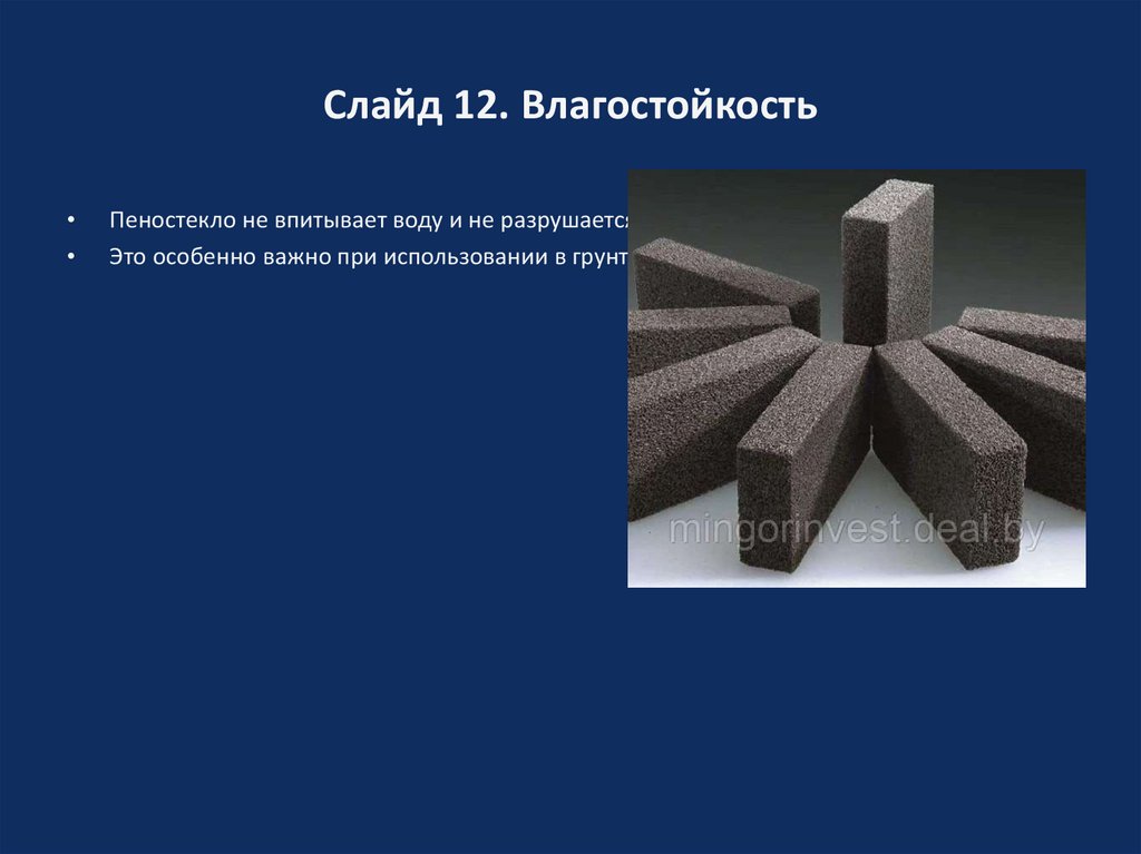 Слайд 12. ВлагостойкостьПеностекло не впитывает воду и не разрушается во влажной среде.