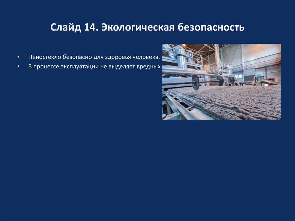 Слайд 14. Экологическая безопасностьПеностекло безопасно для здоровья человека.