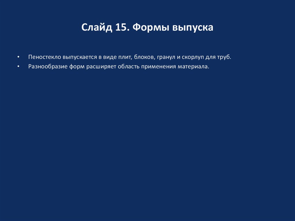 Слайд 15. Формы выпускаПеностекло выпускается в виде плит, блоков, гранул и скорлуп для труб.