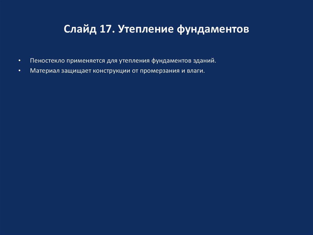 Слайд 17. Утепление фундаментовПеностекло применяется для утепления фундаментов зданий.