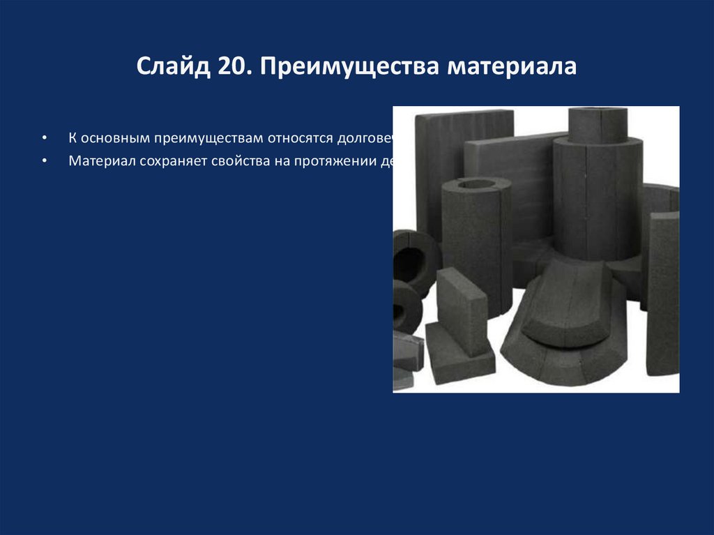 Слайд 20. Преимущества материалаК основным преимуществам относятся долговечность, прочность и влагостойкость.