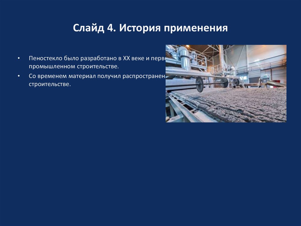 Слайд 4. История примененияПеностекло было разработано в XX веке и первоначально применялось в