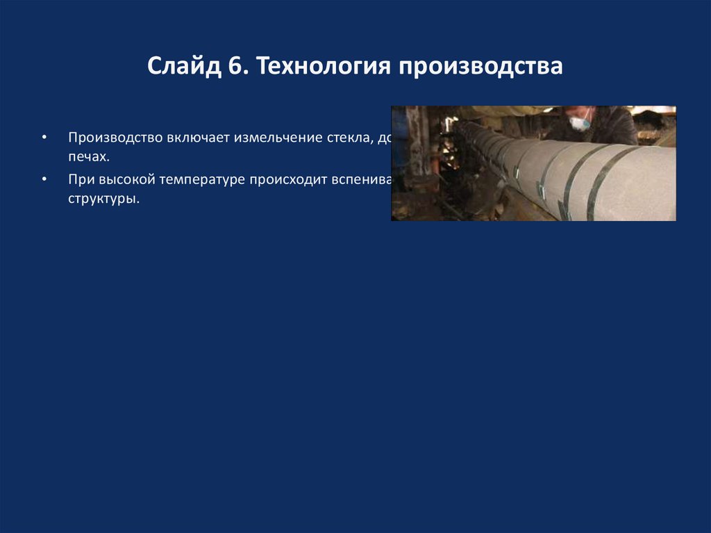 Слайд 6. Технология производстваПроизводство включает измельчение стекла, добавление газообразователей и нагрев в