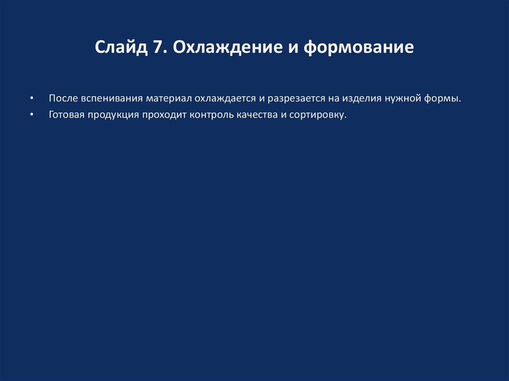 Слайд 7. Охлаждение и формованиеПосле вспенивания материал охлаждается и разрезается на изделия нужной формы.