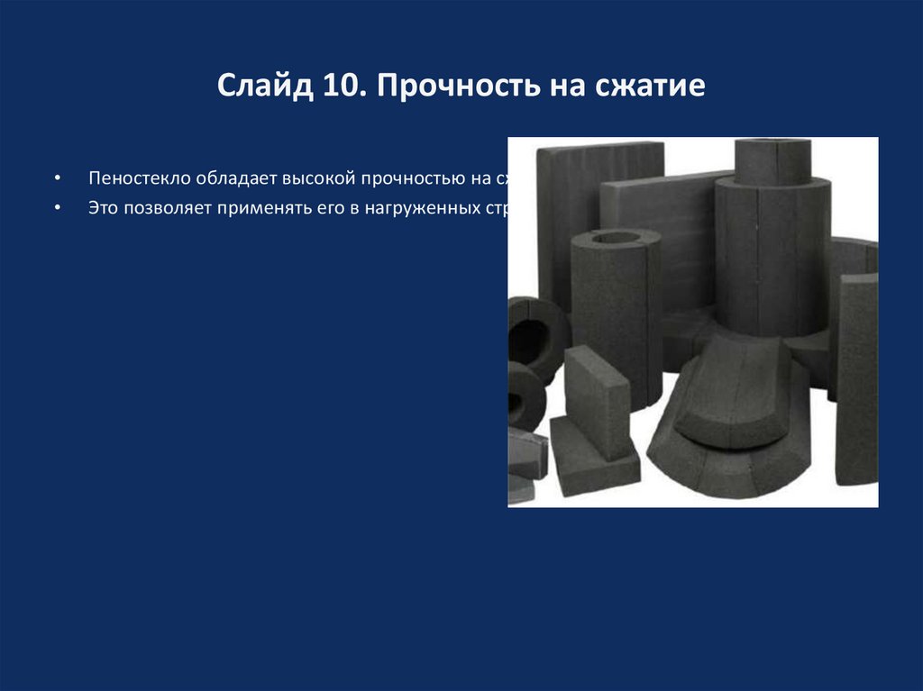 Слайд 10. Прочность на сжатиеПеностекло обладает высокой прочностью на сжатие.