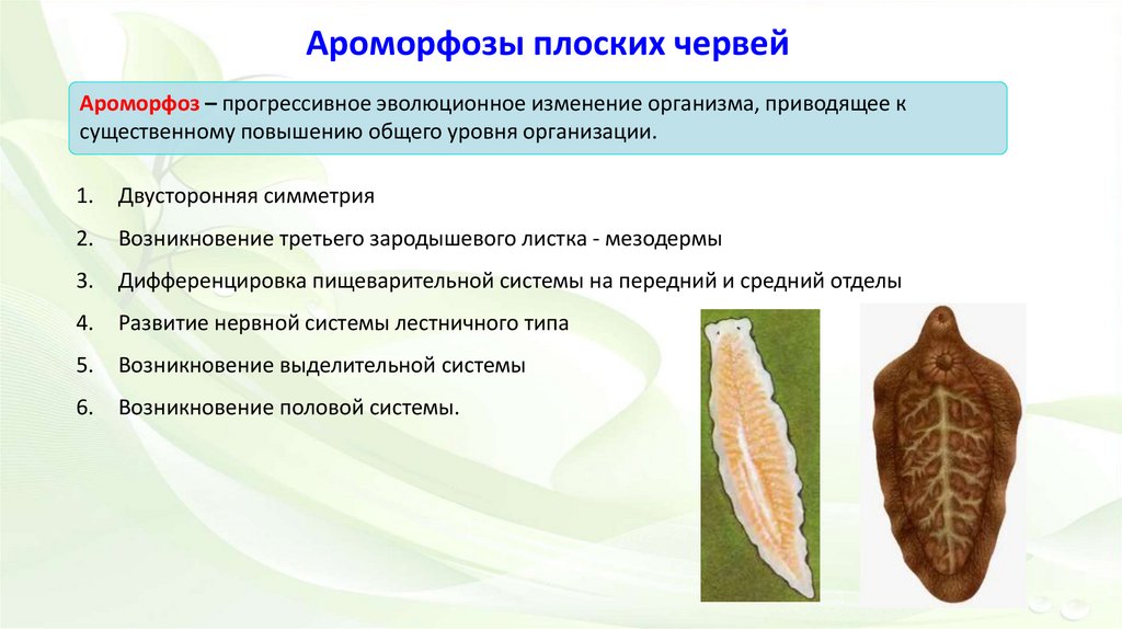 Ароморфозы плоских червейАроморфоз – прогрессивное эволюционное изменение организма, приводящее к