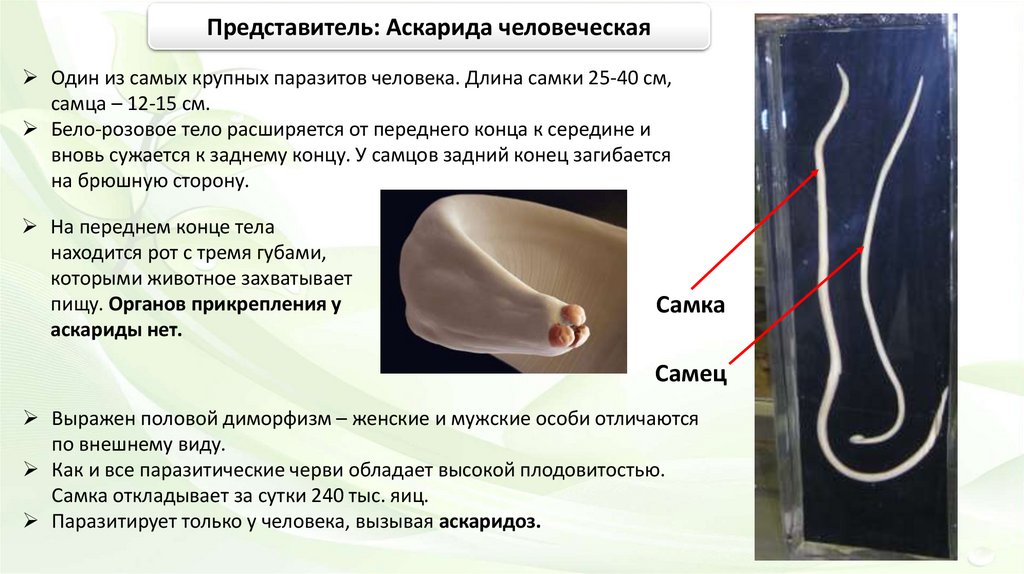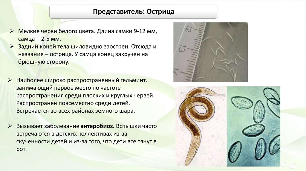 Представитель: ОстрицаМелкие черви белого цвета. Длина самки 9-12 мм,
