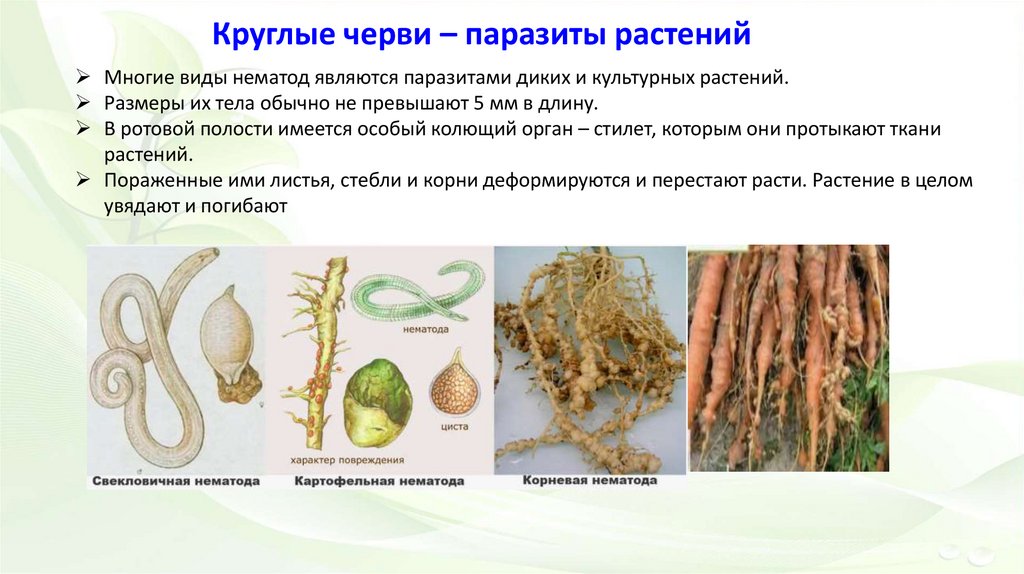 Круглые черви – паразиты растенийМногие виды нематод являются паразитами диких и культурных растений.