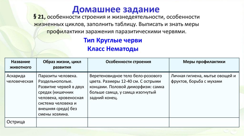 Домашнее задание§ 21, особенности строения и жизнедеятельности, особенности