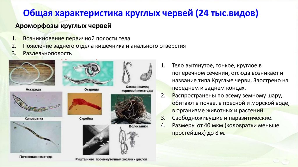 Общая характеристика круглых червей (24 тыс.видов)Ароморфозы круглых червей