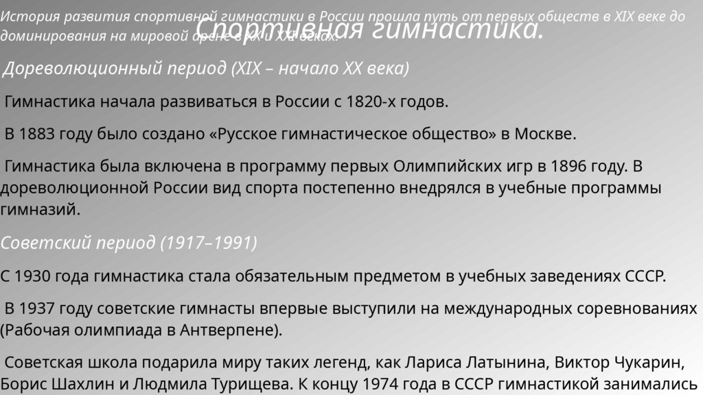 История гимнастики в нашей стране.Зарождение (XVIII — XIX века): Гимнастика начала развиваться как элемент