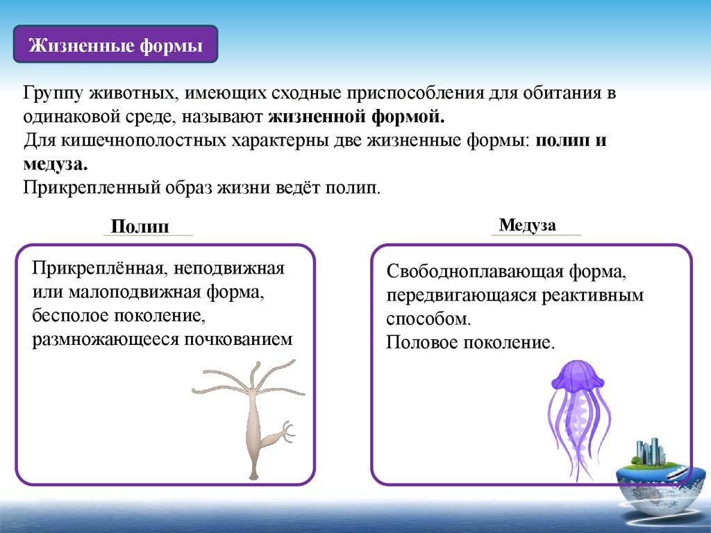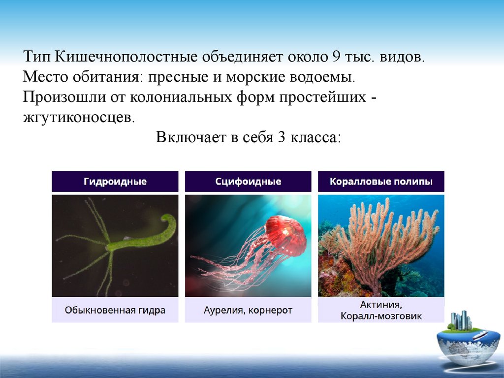 Тип Кишечнополостные объединяет около 9 тыс. видов.Место обитания: пресные и морские водоемы.