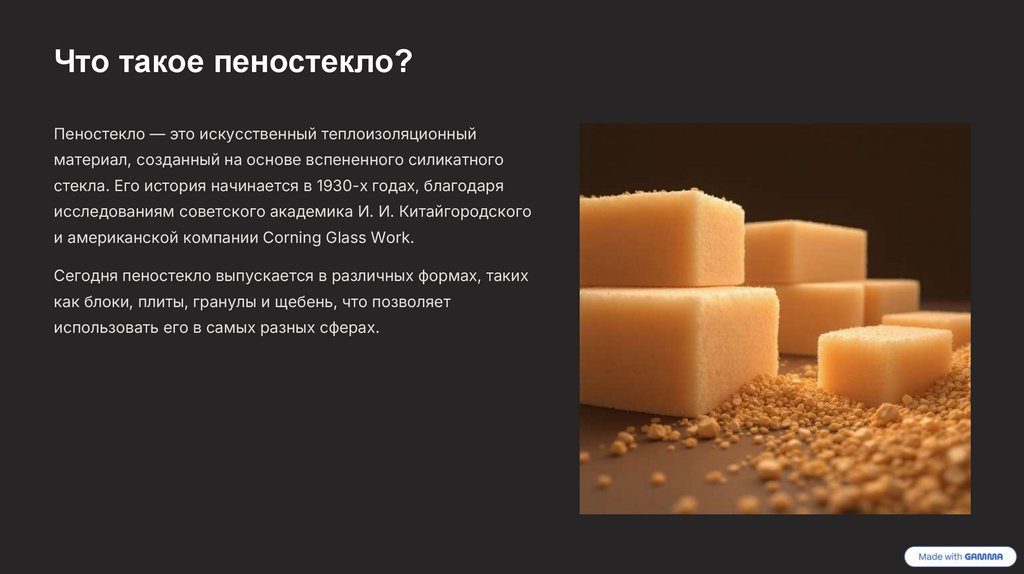 Что такое пеностекло?Пеностекло — это искусственный теплоизоляционный