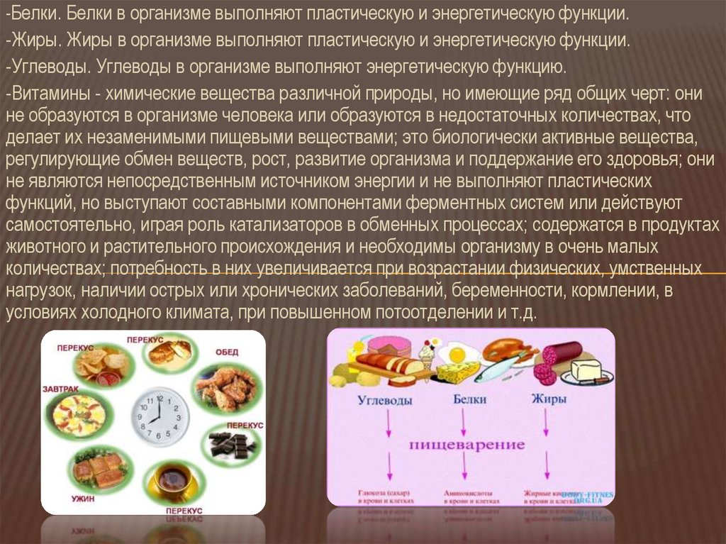 -Белки. Белки в организме выполняют пластическую и энергетическую функции.-Жиры. Жиры в организме выполняют пластическую и энергетическую функции.