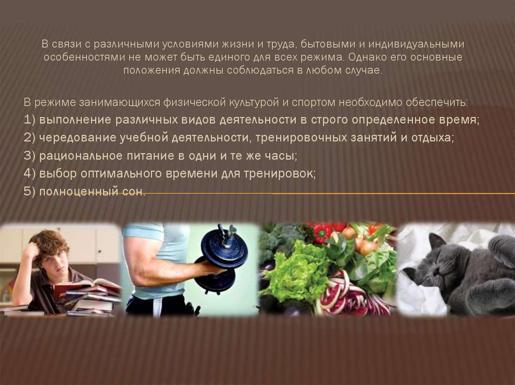 В связи с различными условиями жизни и труда, бытовыми и индивидуальнымиособенностями не может быть единого для всех режима. Однако его основные