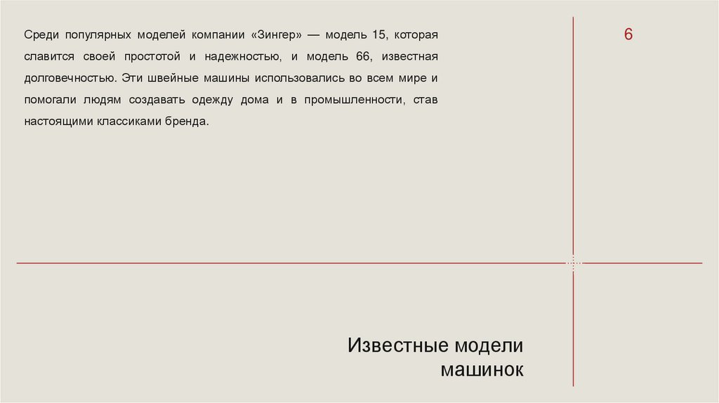 Среди популярных моделей компании «Зингер» — модель 15, котораяславится своей простотой и надежностью, и модель 66, известная