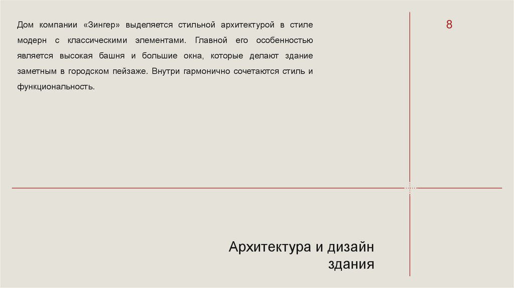 Дом компании «Зингер» выделяется стильной архитектурой в стилемодерн с классическими элементами. Главной его особенностью