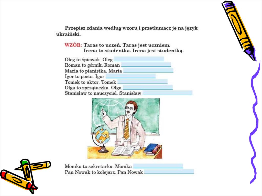 tłumacz, marynarz, celnik, rolnik, urzędnik, emeryt