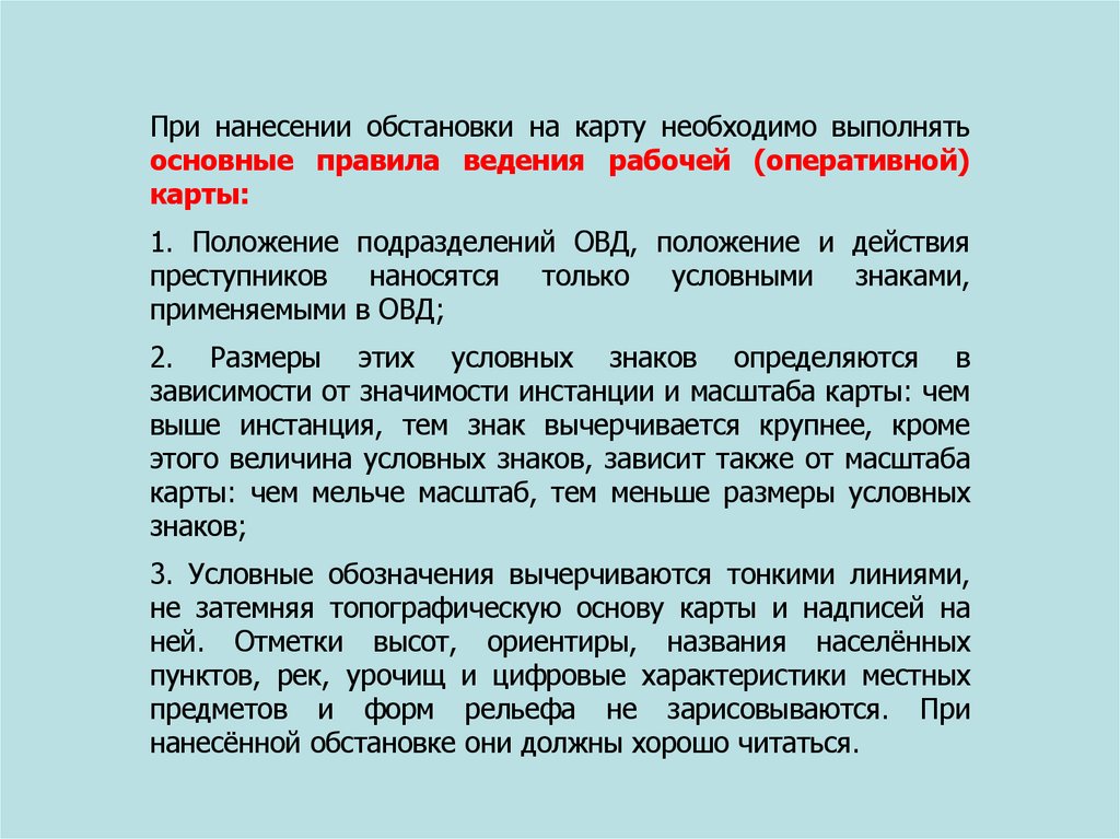 При нанесении обстановки на карту необходимо выполнятьосновные правила ведения рабочей (оперативной)