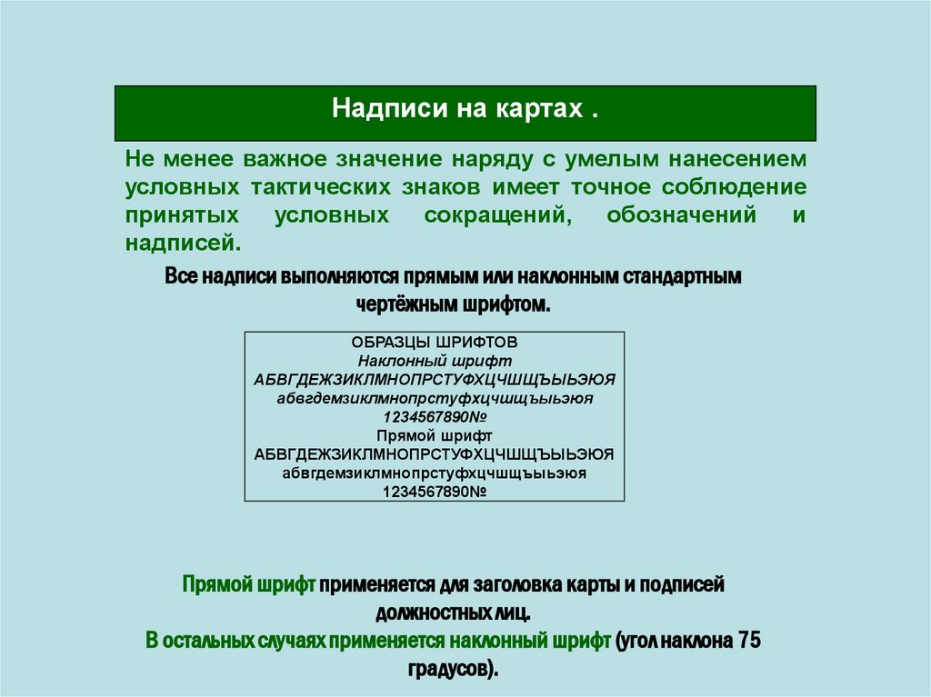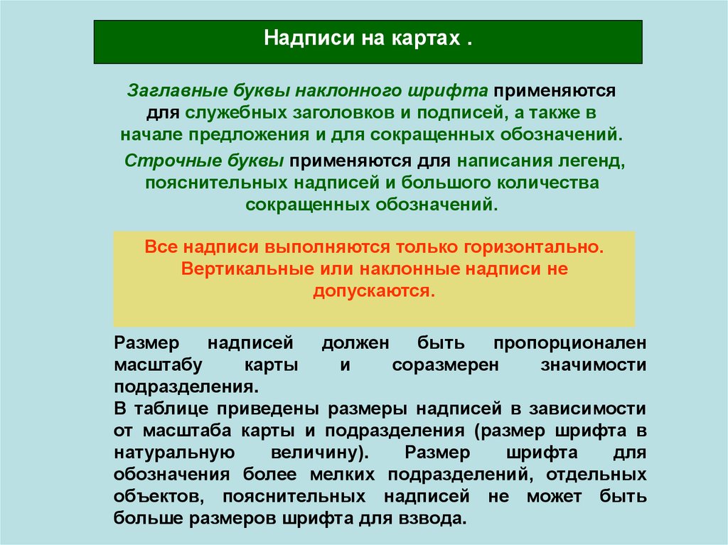 Надписи на картах .Заглавные буквы наклонного шрифта применяются