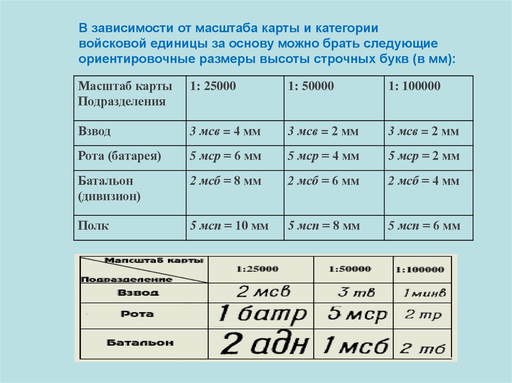 В зависимости от масштаба карты и категориивойсковой единицы за основу можно брать следующие