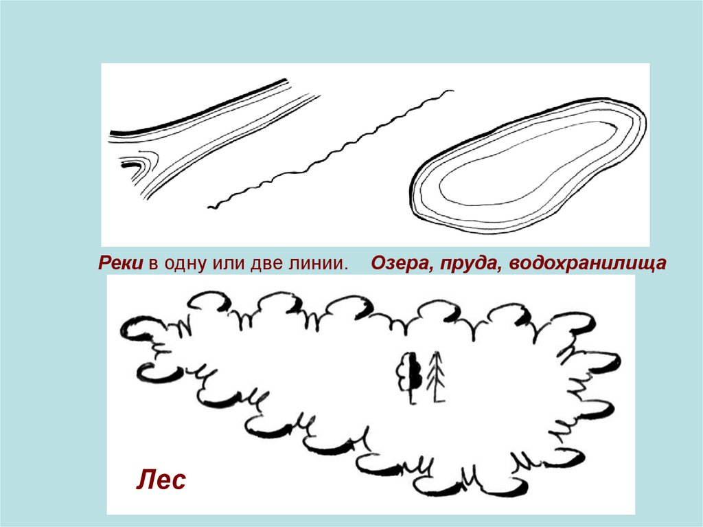 При изображении на схемах рельефа, лесной растительности,объектов гидрографии используются специальные условные