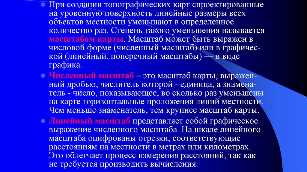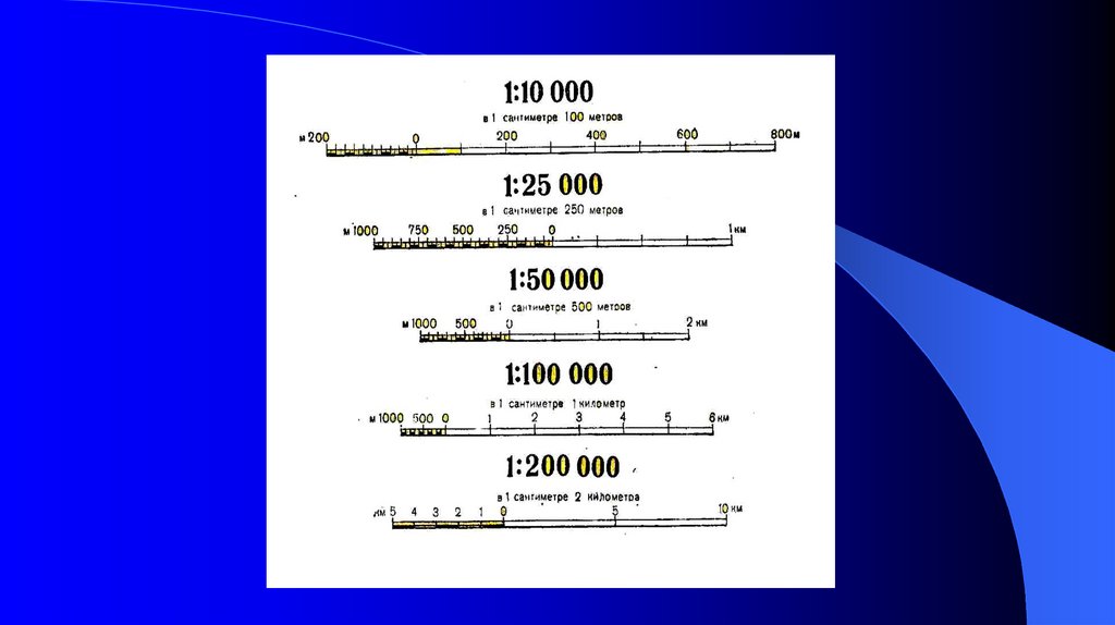 числовой форме (численный масштаб) или в графической (линейный, поперечный масштабы) — в виде