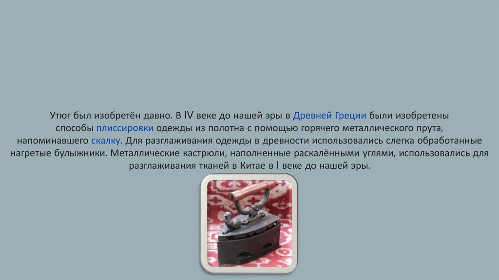Утюг был изобретён давно. В IV веке до нашей эры в Древней Греции были изобретеныспособы плиссировки одежды из полотна с помощью горячего металлического прута,