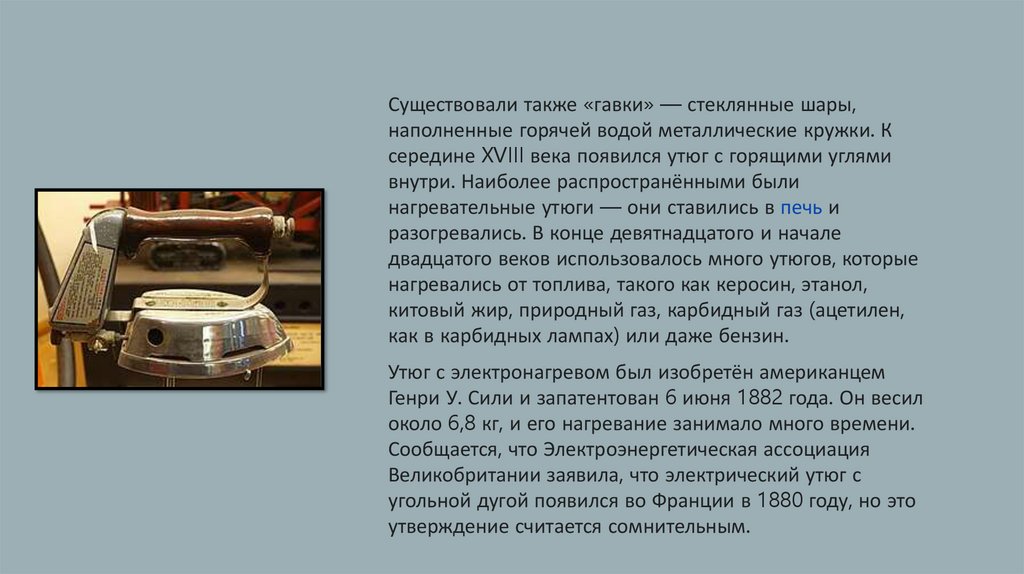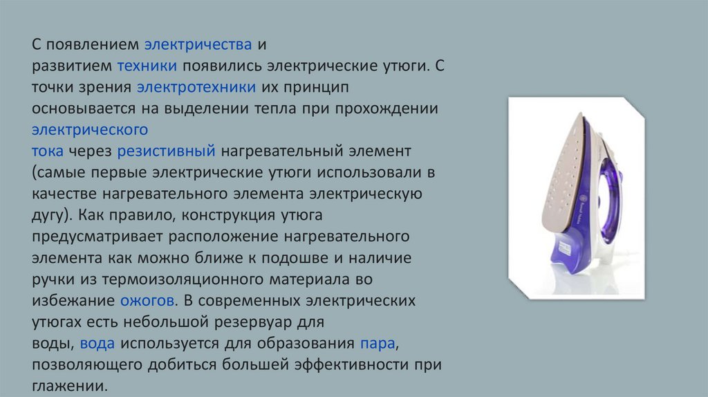 • С появлением электричества иразвитием техники появились электрические утюги. С