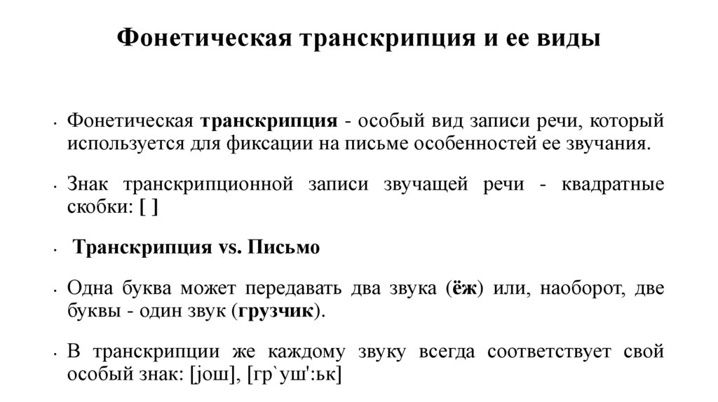 Фонетическая транскрипция и ее видыФонетическая транскрипция - особый вид записи речи, который