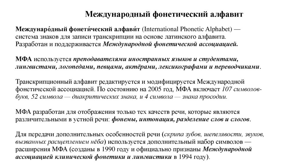 Международный фонетический алфавитМеждунаро́дный фонети́ческий алфави́т (International Phonetic Alphabet) —