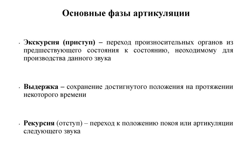 Основные фазы артикуляцииЭкскурсия (приступ) – переход произносительных органов из