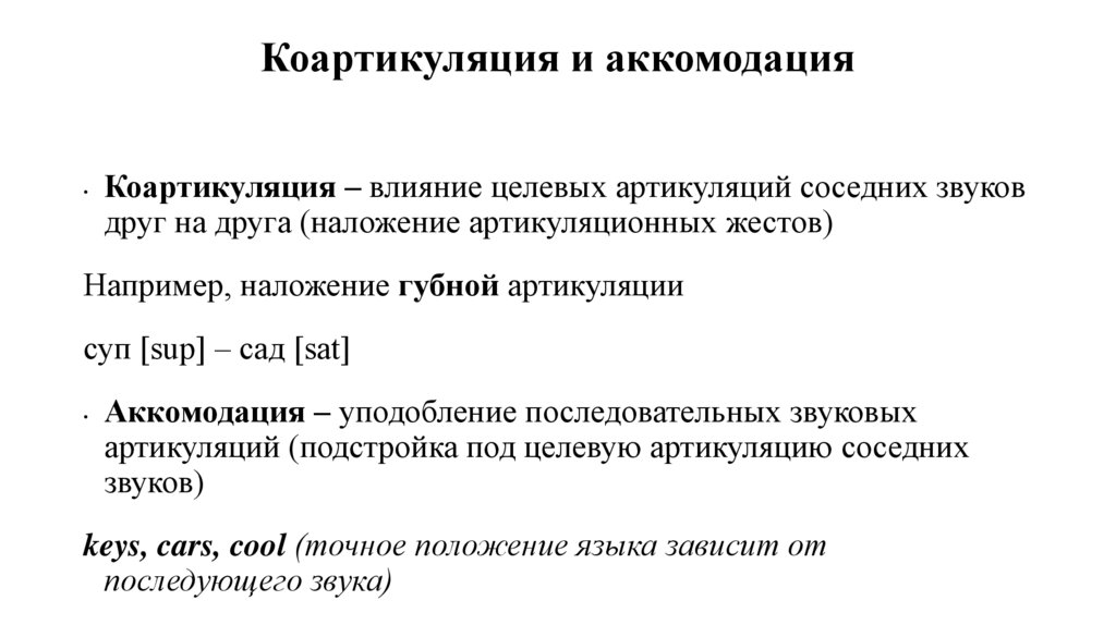 Коартикуляция и аккомодацияКоартикуляция – влияние целевых артикуляций соседних звуков