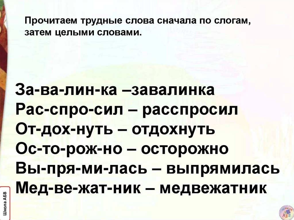 Школа АБВПрочитаем трудные слова сначала по слогам,