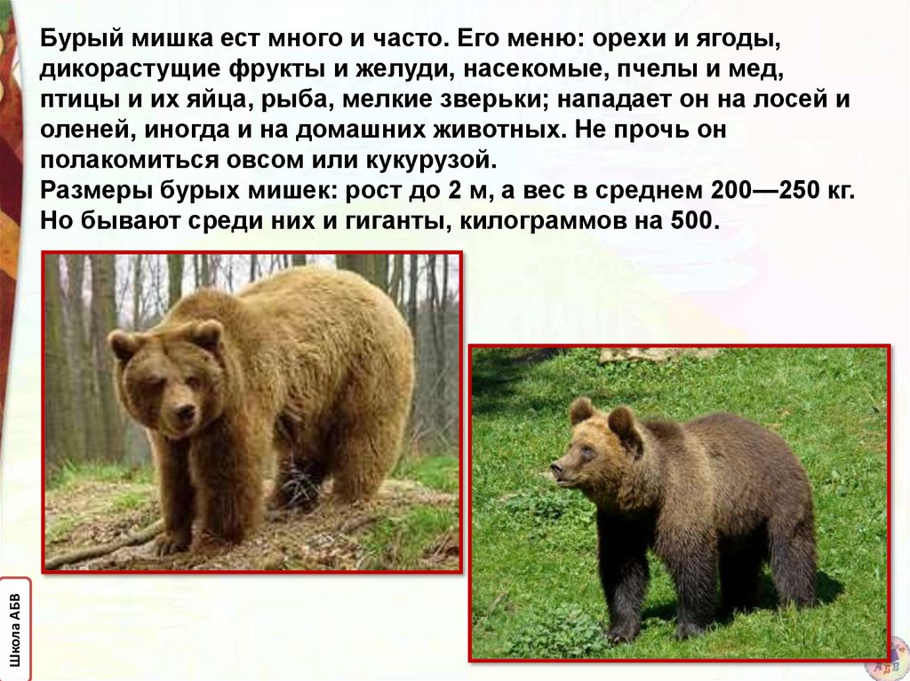 Размеры бурых мишек: рост до 2 м, а вес в среднем 200—250 кг.