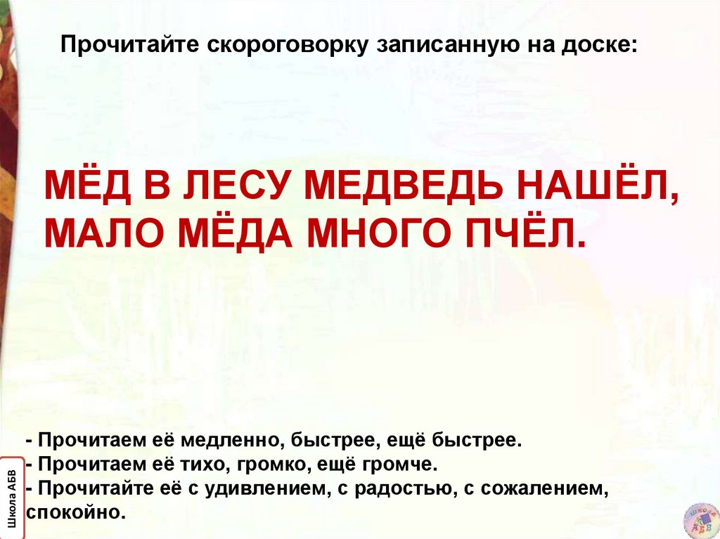 Прочитайте скороговорку записанную на доске:Школа АБВ