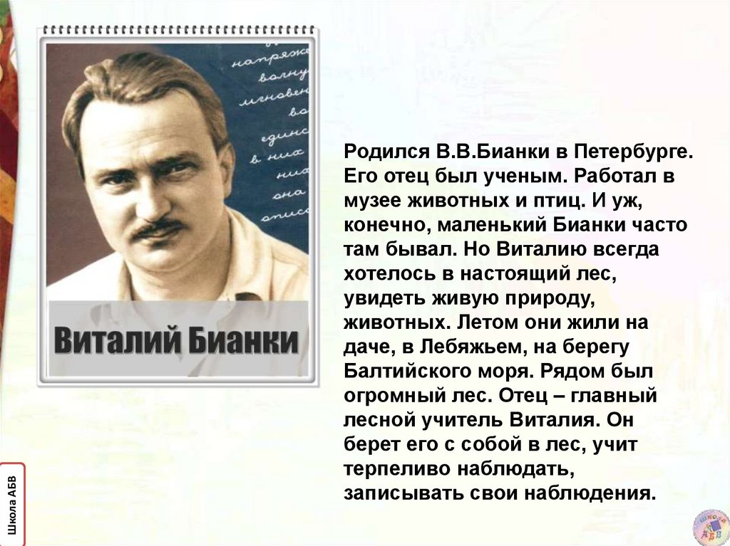 Школа АБВРодился В.В.Бианки в Петербурге.