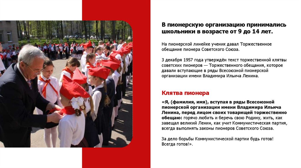 В пионерскую организацию принималисьшкольники в возрасте от 9 до 14 лет.