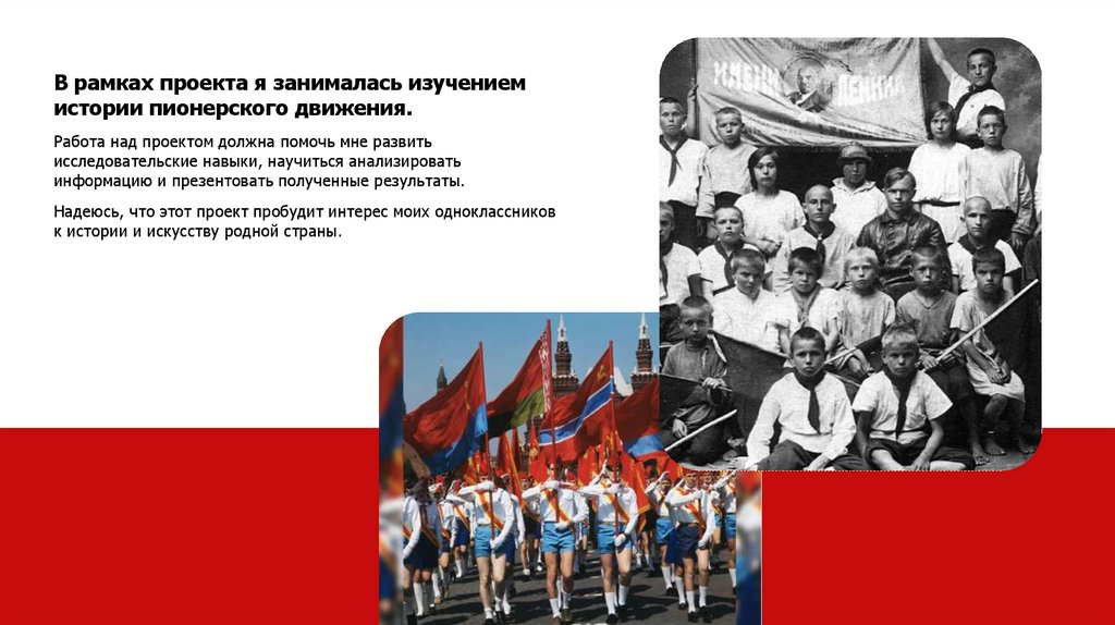 В рамках проекта я занималась изучениемистории пионерского движения.