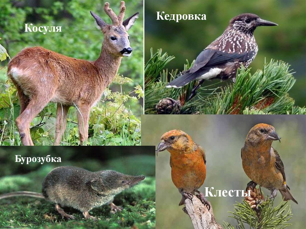 бурозубки, мыши. Из птиц: глухарь, рябчик, кедровка, клесты.