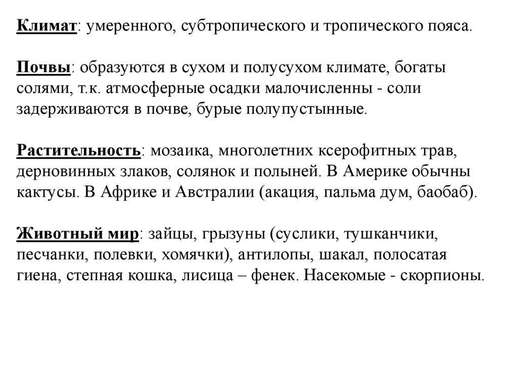 Климат: умеренного, субтропического и тропического пояса.Почвы: образуются в сухом и полусухом климате, богаты