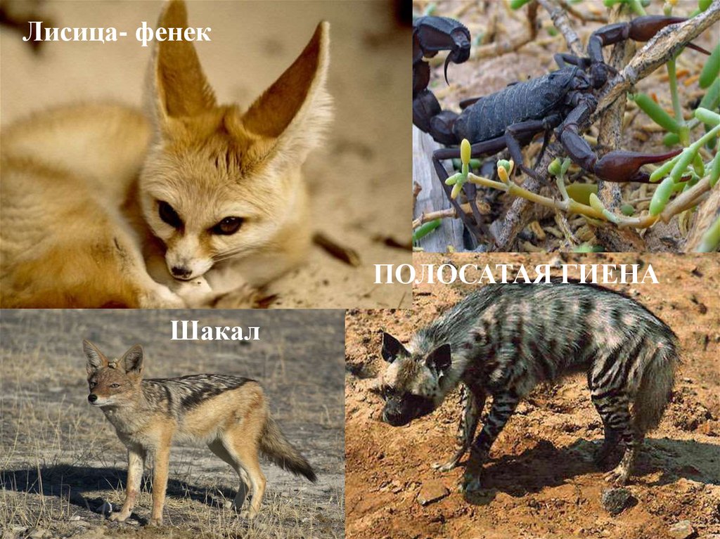 гиена, степная кошка, лисица – фенек. Насекомые - скорпионы.