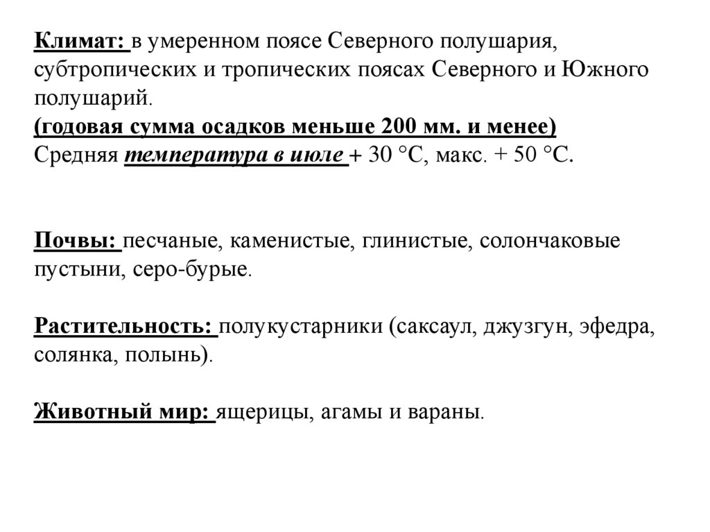 Равнинная поверхность, редкая растительностьи животный мир или их отсутствие.