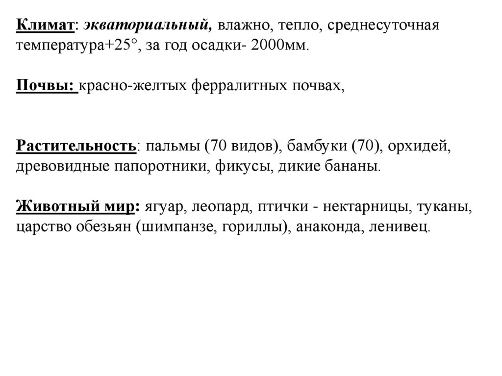 Климат: экваториальный, влажно, тепло, среднесуточнаятемпература+25°, за год осадки- 2000мм.