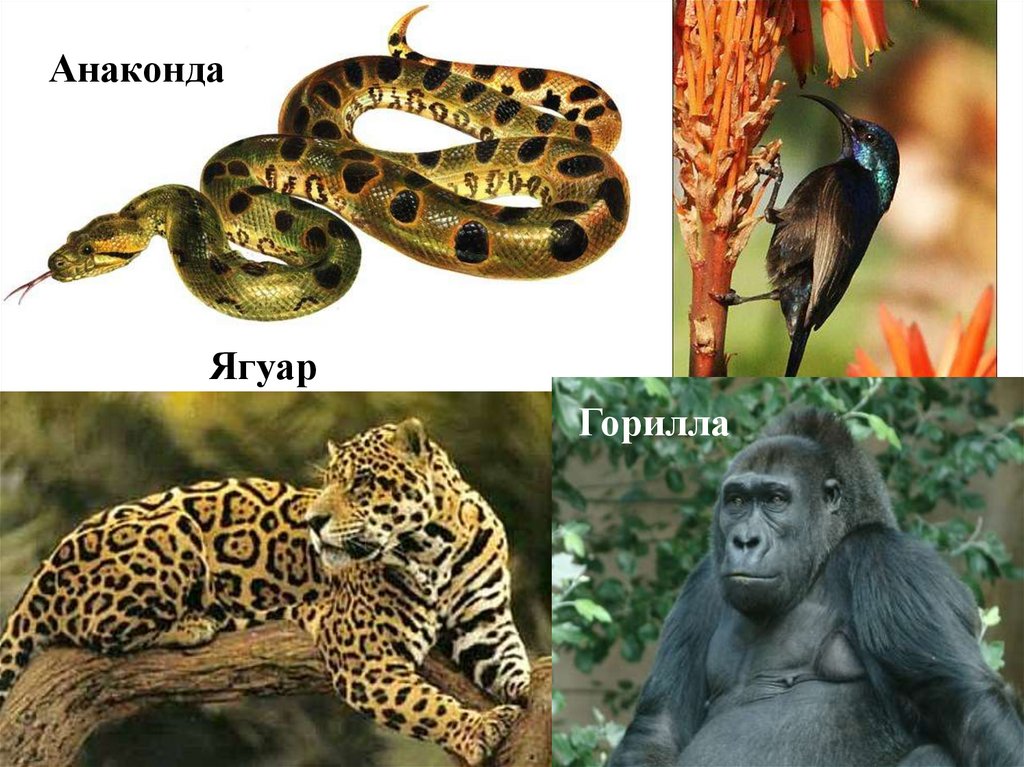 царство обезьян (шимпанзе, гориллы), анаконда, ленивец.
