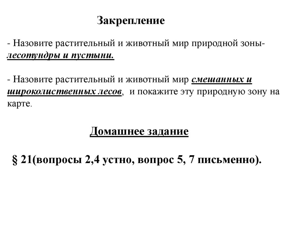Закрепление- Назовите растительный и животный мир природной зонылесотундры и пустыни.