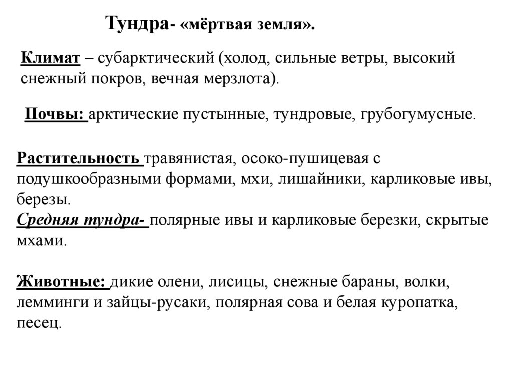 Тундра- «мёртвая земля».Климат – субарктический (холод, сильные ветры, высокий