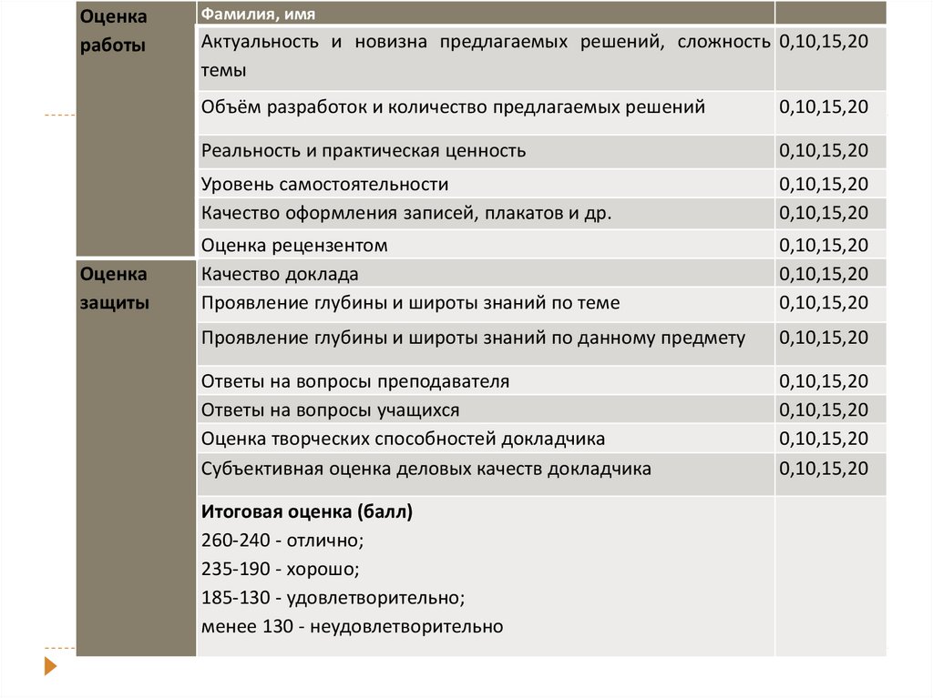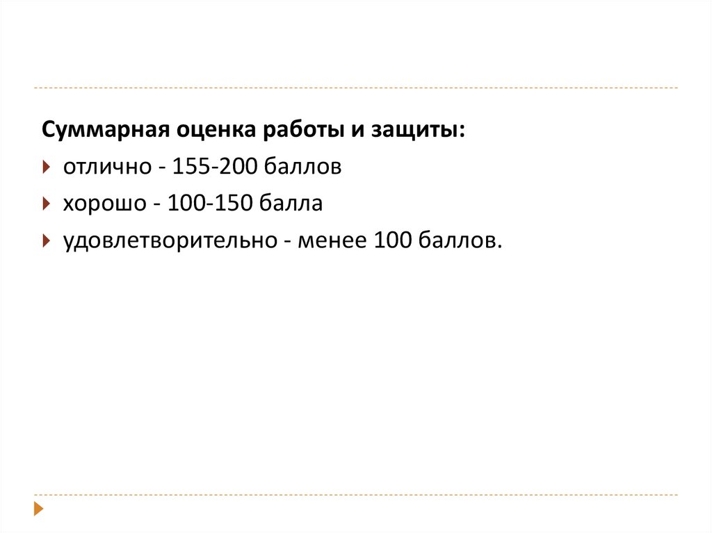Суммарная оценка работы и защиты:отлично - 155-200 баллов