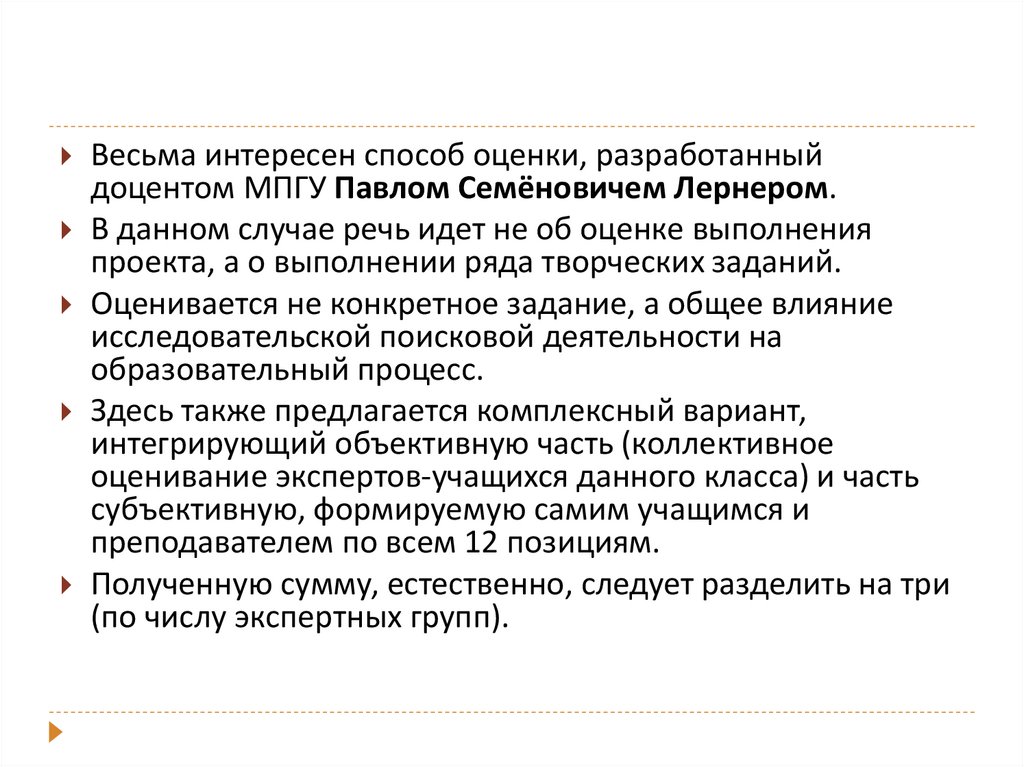 Весьма интересен способ оценки, разработанныйдоцентом МПГУ Павлом Семёновичем Лернером.