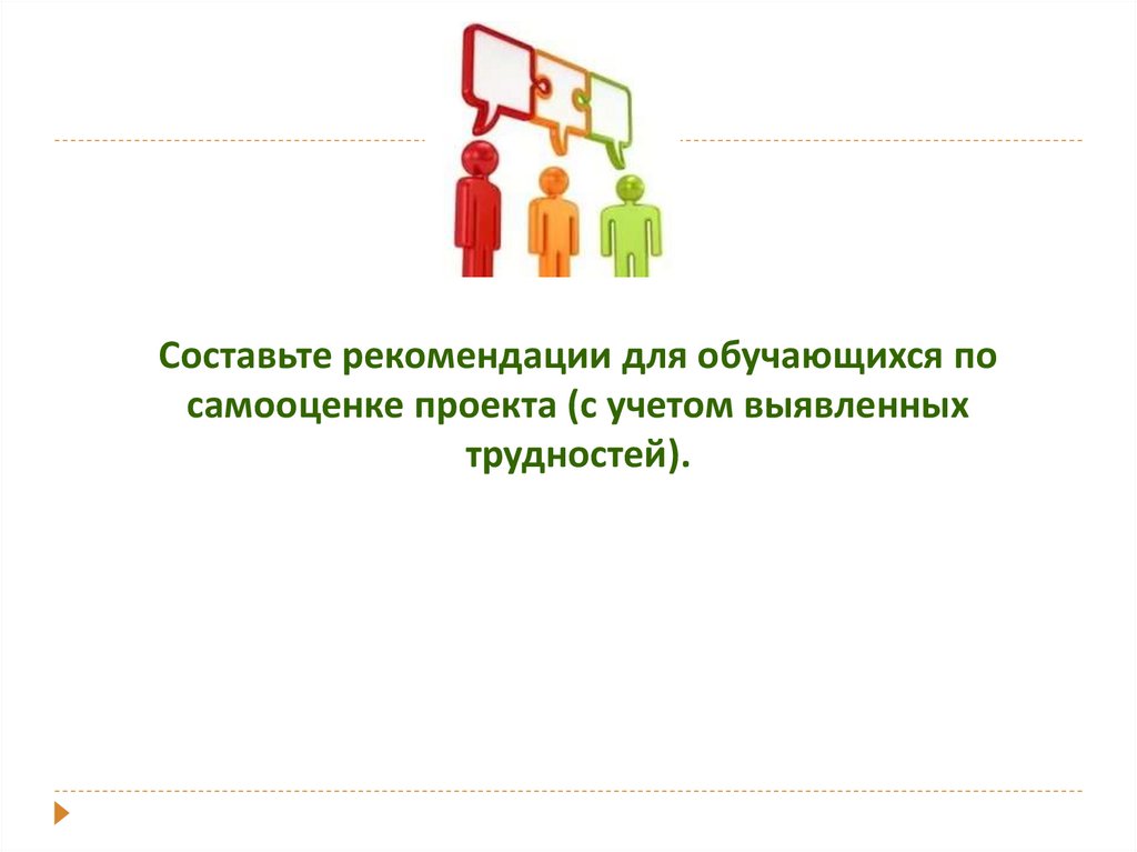 Составьте рекомендации для обучающихся посамооценке проекта (с учетом выявленных